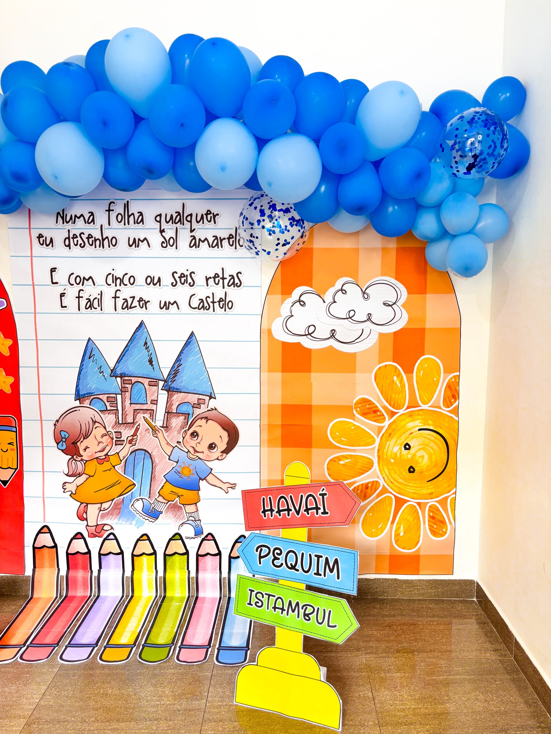 No chão, os lápis coloridos e o tapete ilustrado tornam tudo ainda mais envolvente 🖍️🌈, enquanto o arco de bexigas completa o clima festivo e acolhedor 🎉💙