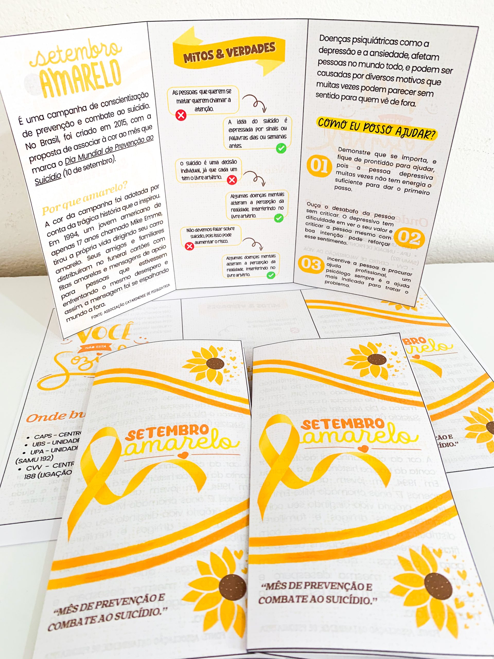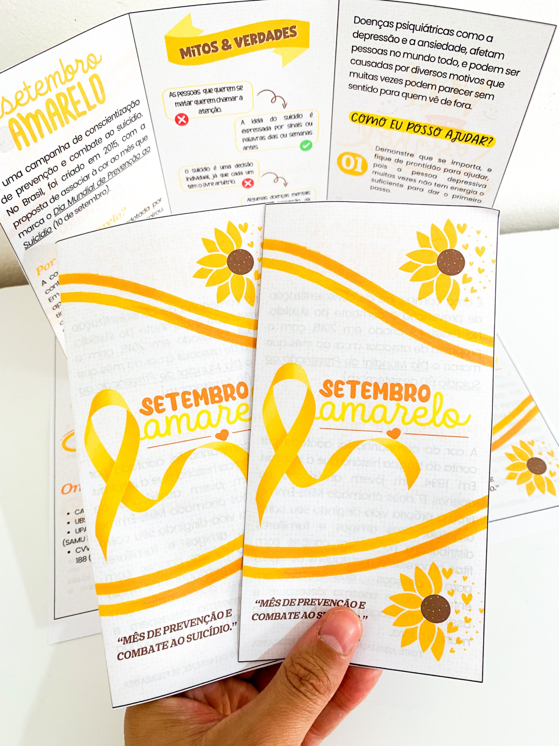 Material informativo e ilustrado sobre a campanha Setembro Amarelo, que promove a conscientização e a prevenção ao suicídio.